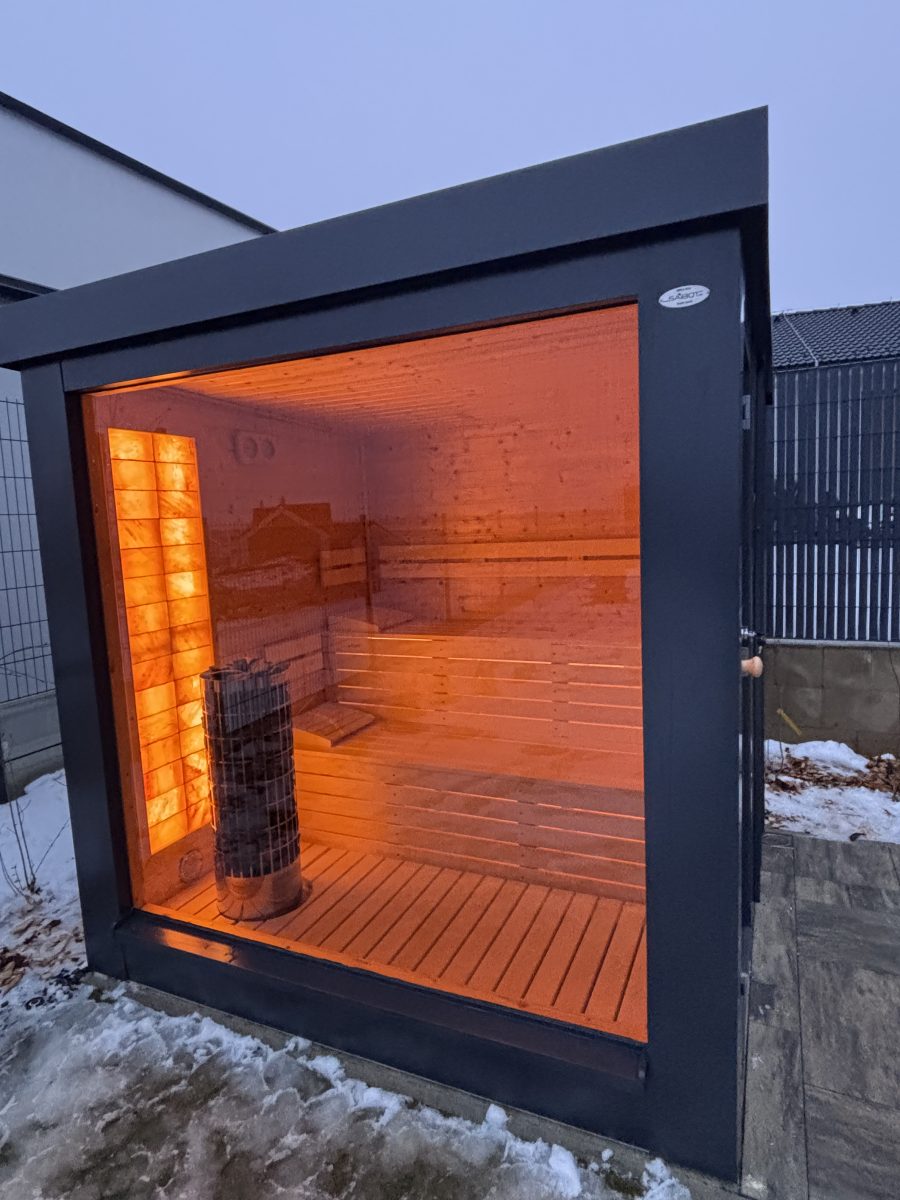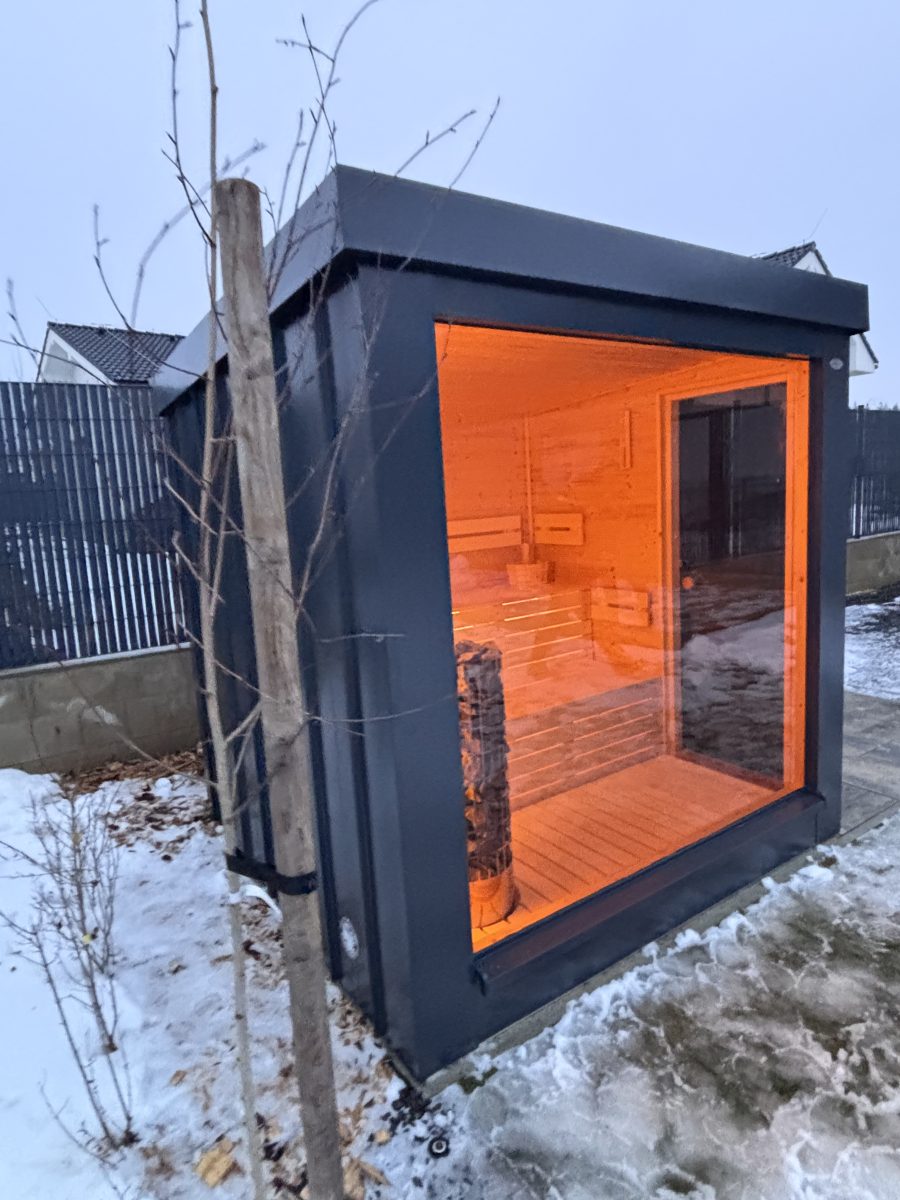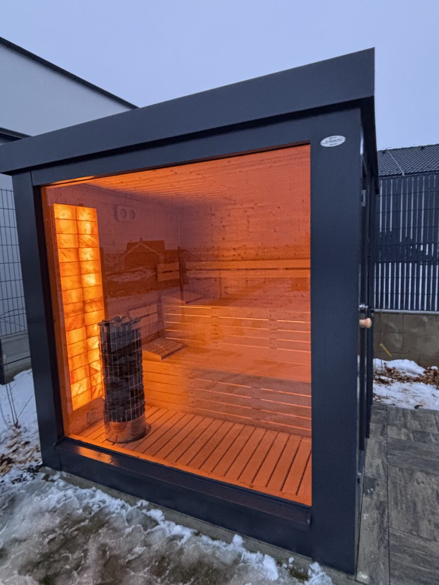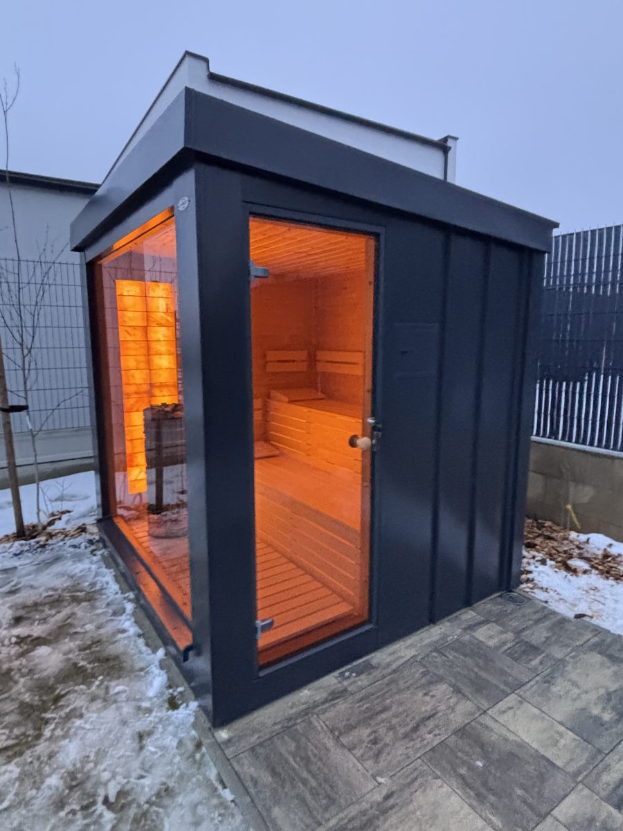 Exteriérová sauna SAIBOT PANORAMA, zvonku oplechovaná v bezúdržbovom clippaneli, vnútorný obklad je sibírskky smrekovec, schodiskové lavice z osiky bielej, soľná stena s led podsvietením