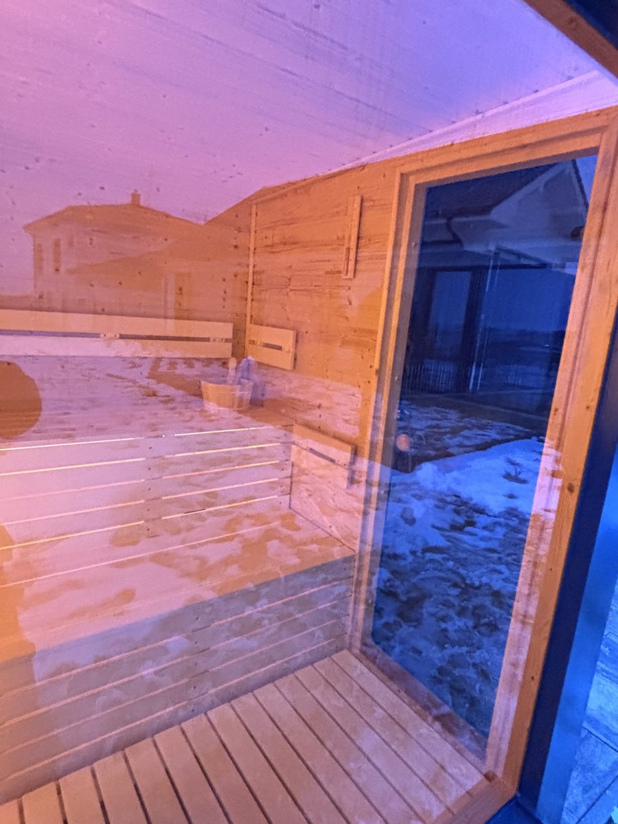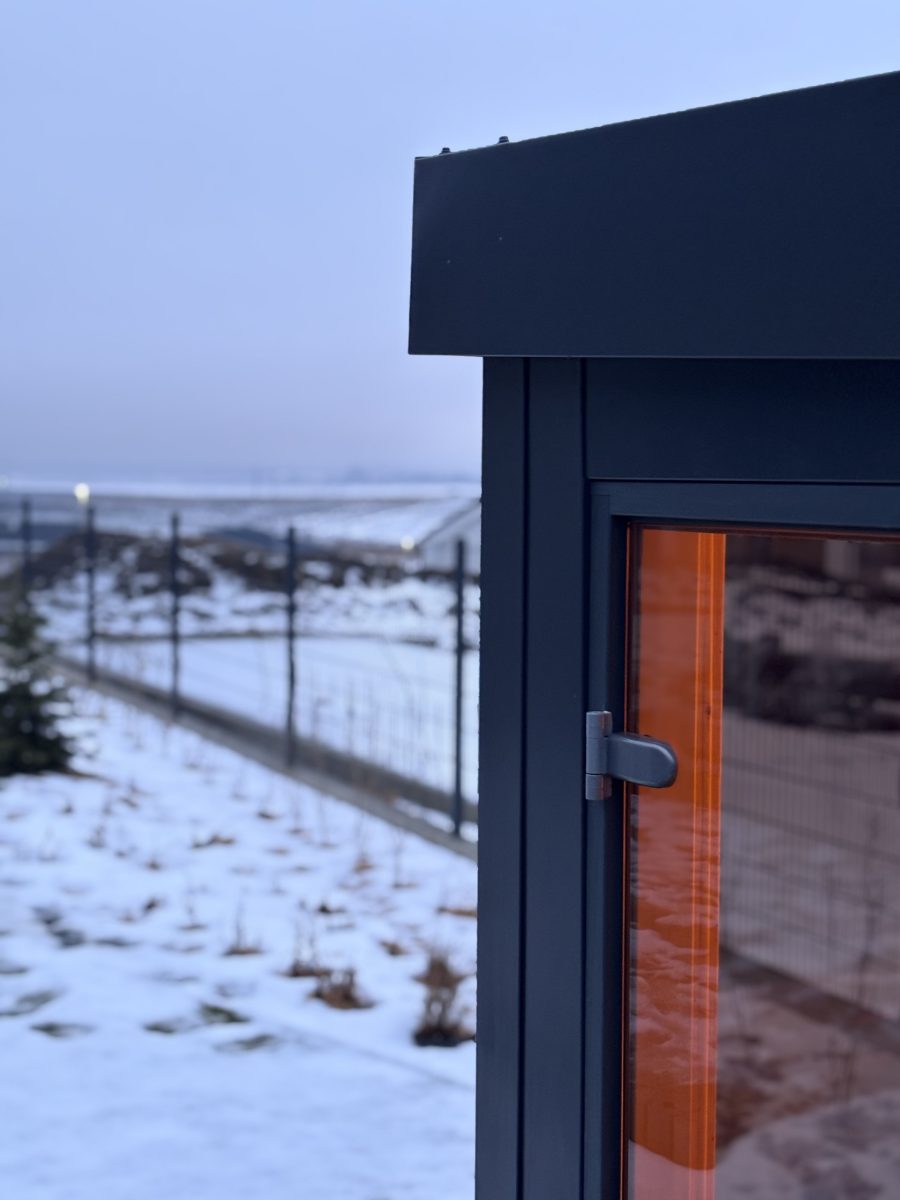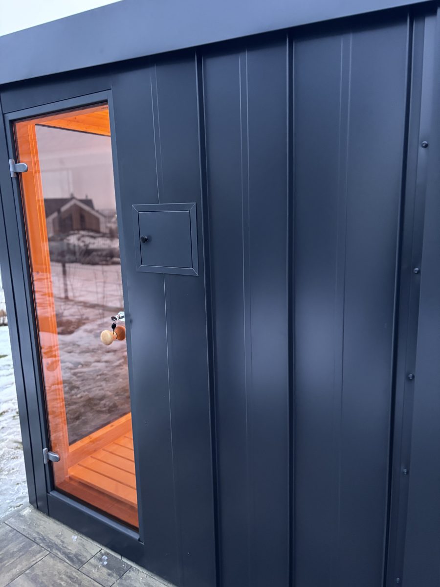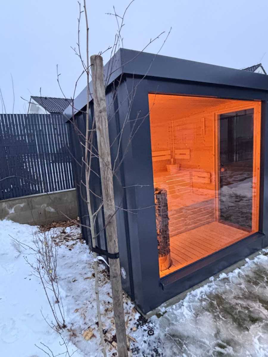 Exteriérová sauna SAIBOT PANORAMA, zvonku oplechovaná v bezúdržbovom clippaneli, vnútorný obklad je sibírskky smrekovec, schodiskové lavice z osiky bielej, soľná stena s led podsvietením